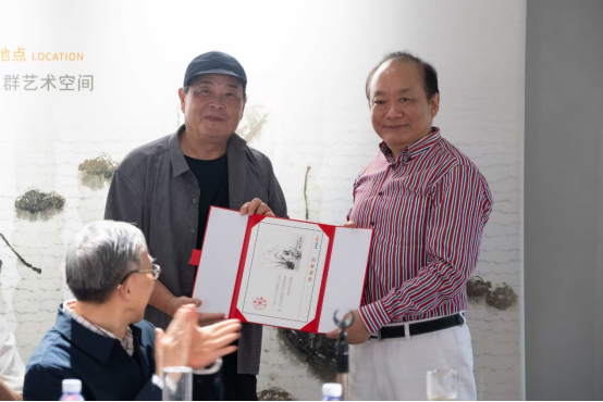 齐铁偕向觉群书画院捐《记得出处》画一幅,乐震文院长颁发收藏证书。