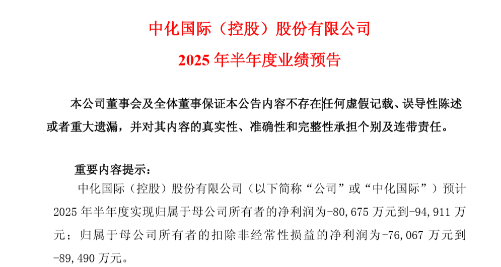 7月11日,中化国际(600500)发布公告,预计2025年半年度实现归母净利润约亏损8.07亿元至9.49亿元,归母净利润扣除非经常性损益后约亏损7.61亿元至8.95亿元。上年同期归母净利润为1232万元,扣除非经常性损益的净利润为亏损8.25亿元。