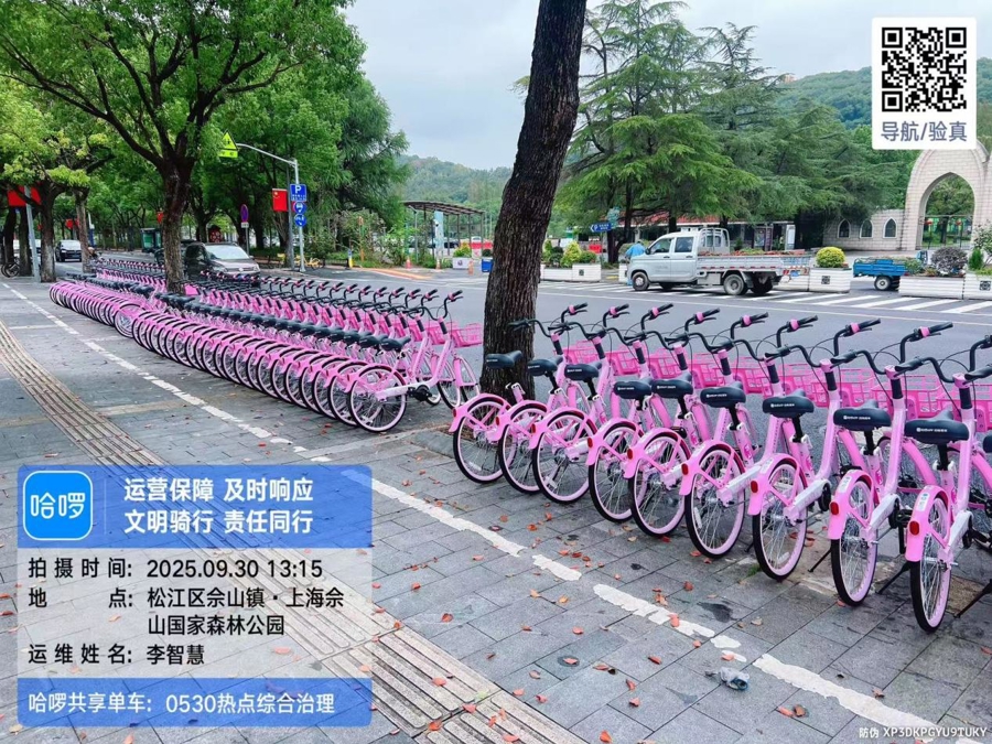 国庆前夕,佘山度假区定制的230辆共享单车已全部投放市场。市民可以在北外滩、东方体育中心、徐家汇、月湖雕塑公园、佘山森林公园周边看到粉红色佘山定制款哈啰单车。
